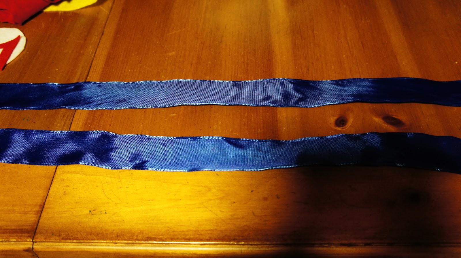 For the suspenders, just bring the ribbon from one side and bring it around your neck to the other side (saves more ribbon and is easier to attach to your pants)