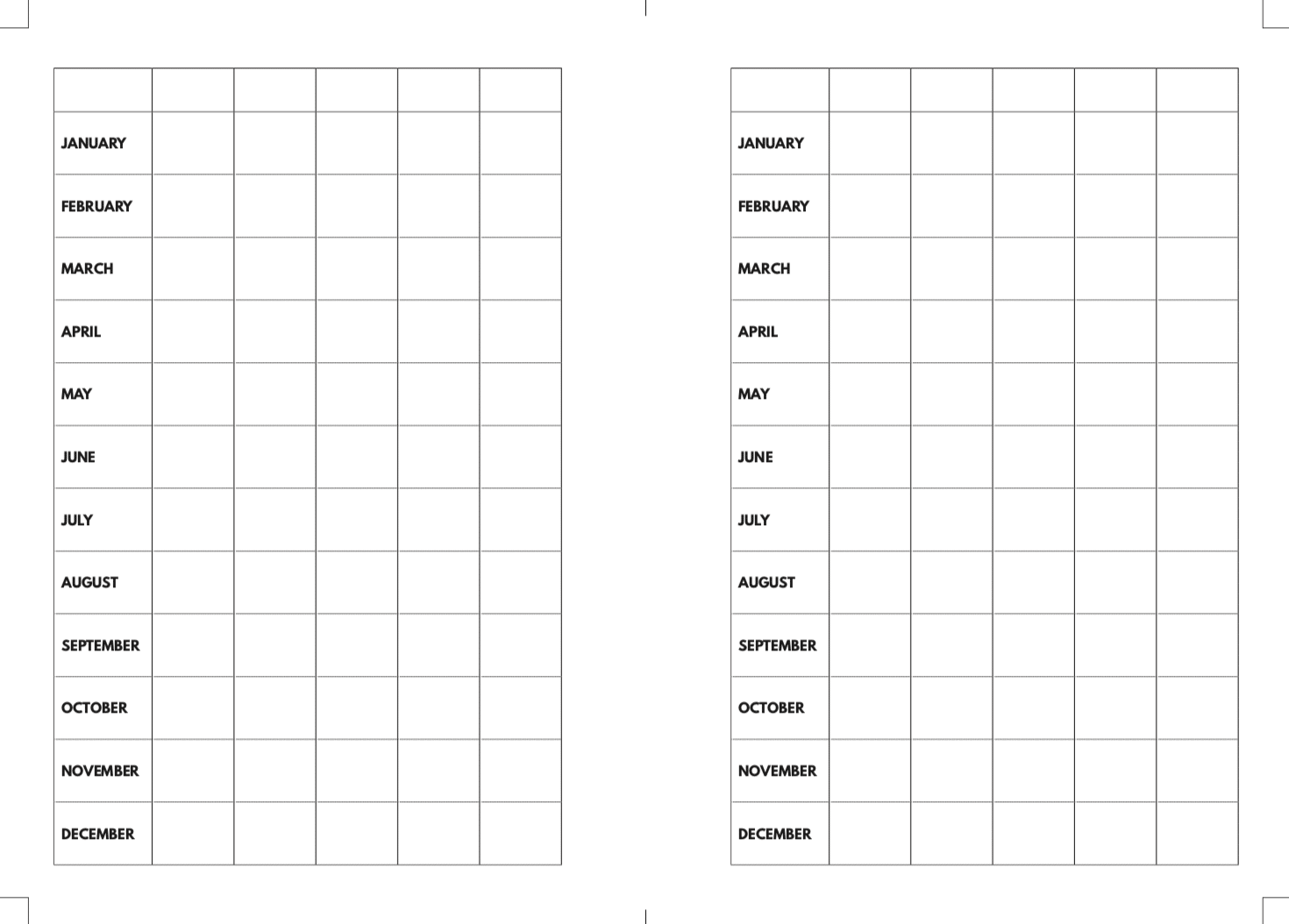 - tracking your expenses each month (categories can be written on the side like: groceries, eating out, clothes, fun, etc. then totaled in the box each month).