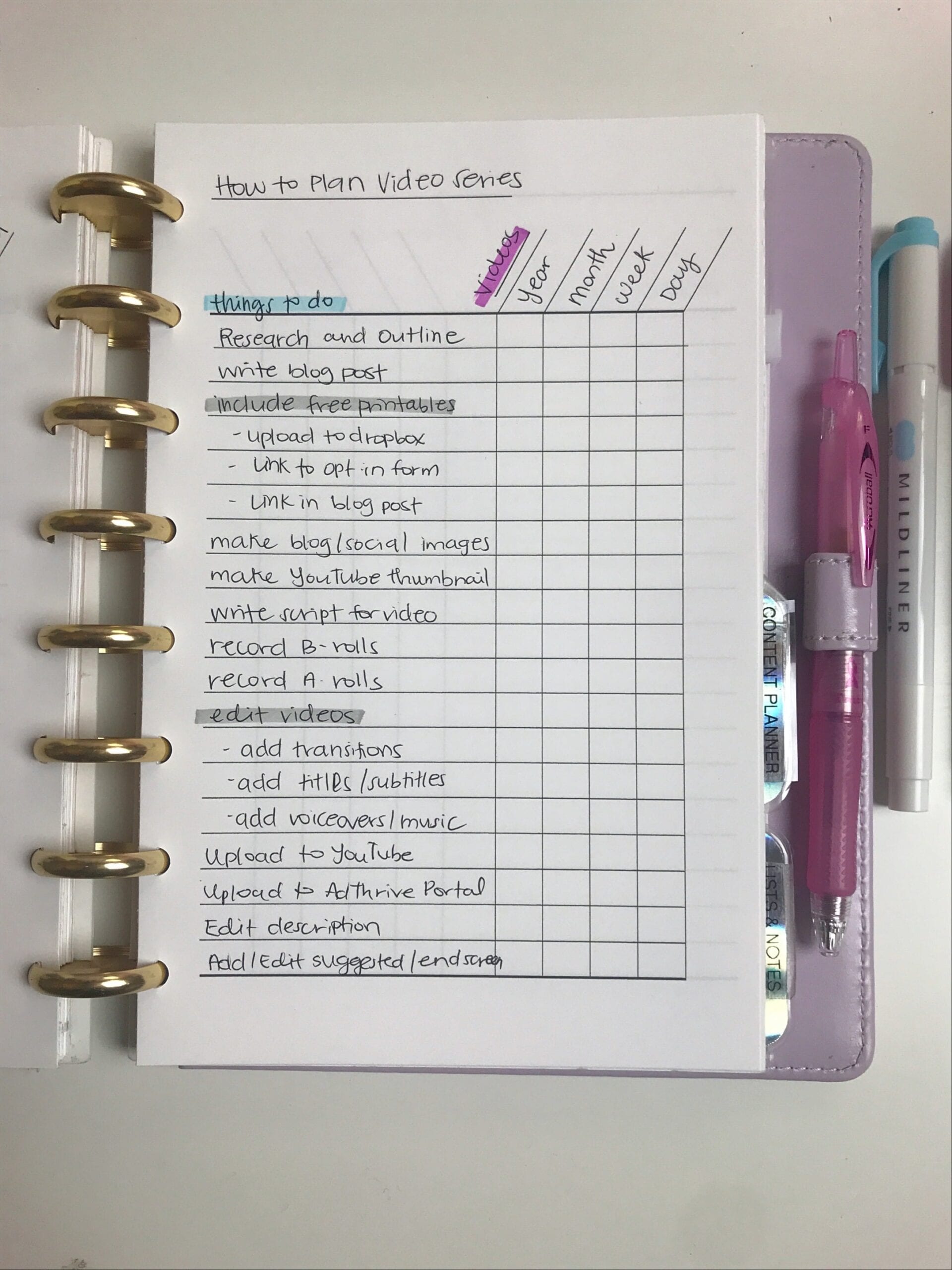 In the next example, I decided to switch it up. Since I have way more tasks to do, but less topics to cover I decided to switch the workflow around. So I put the topics of the video titles along the top, and all the tasks I have to do down the list.