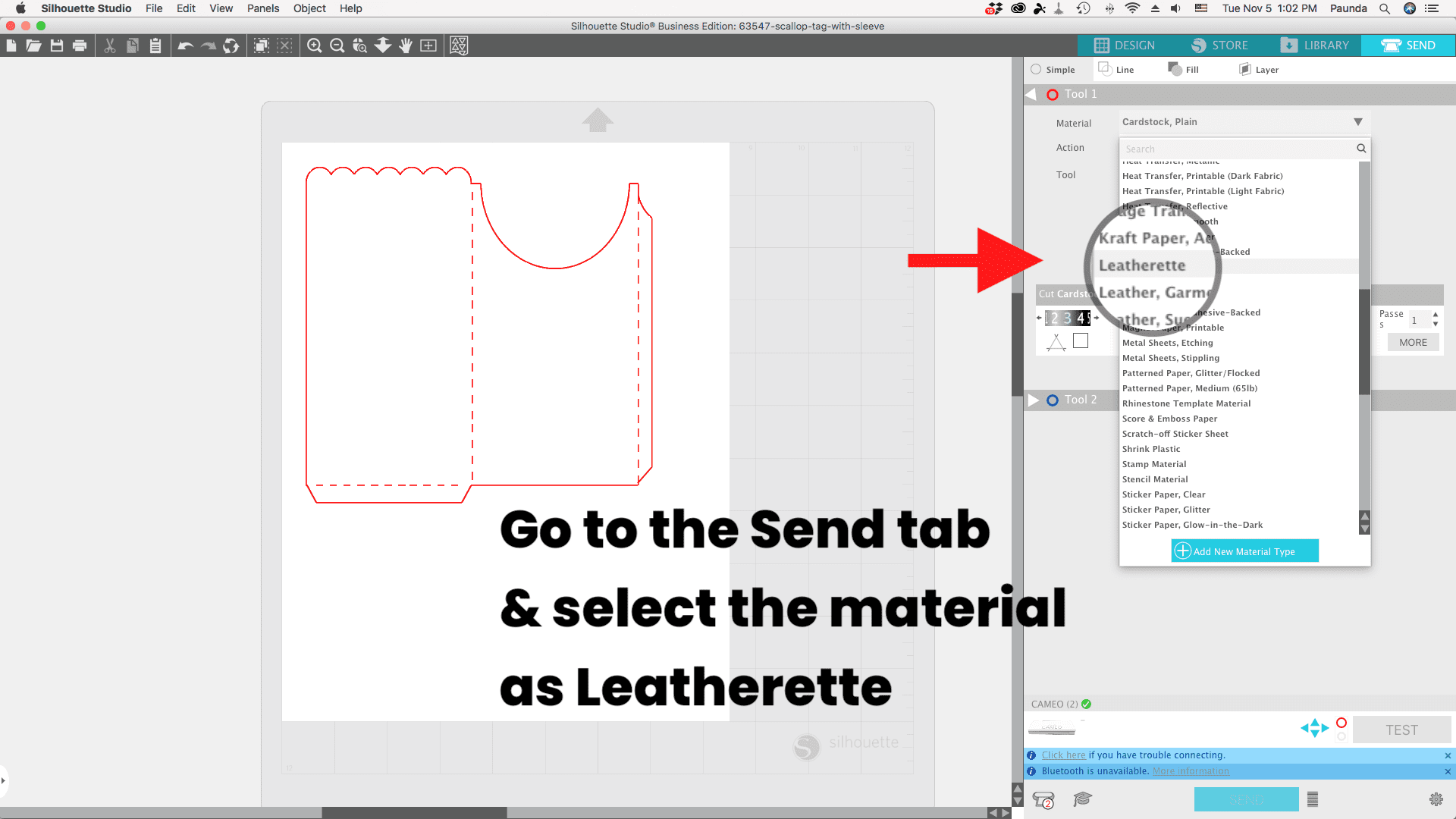 Then go to the “Send” tab and click on the material you are using – Leatherette sheets. The settings for the Leatherette sheets worked perfectly for me. Adjust your blade so it matches, or skip if you are using an autoblade. Then hit Send to start cutting.
