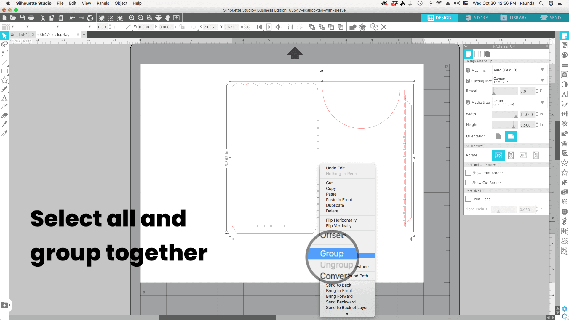 Go to “Page Setup” and make sure your workspace matches the size of paper you will be working with (should be 8.5 by 11 inches) and the cutting mat you will be using (I am using a cameo mat).