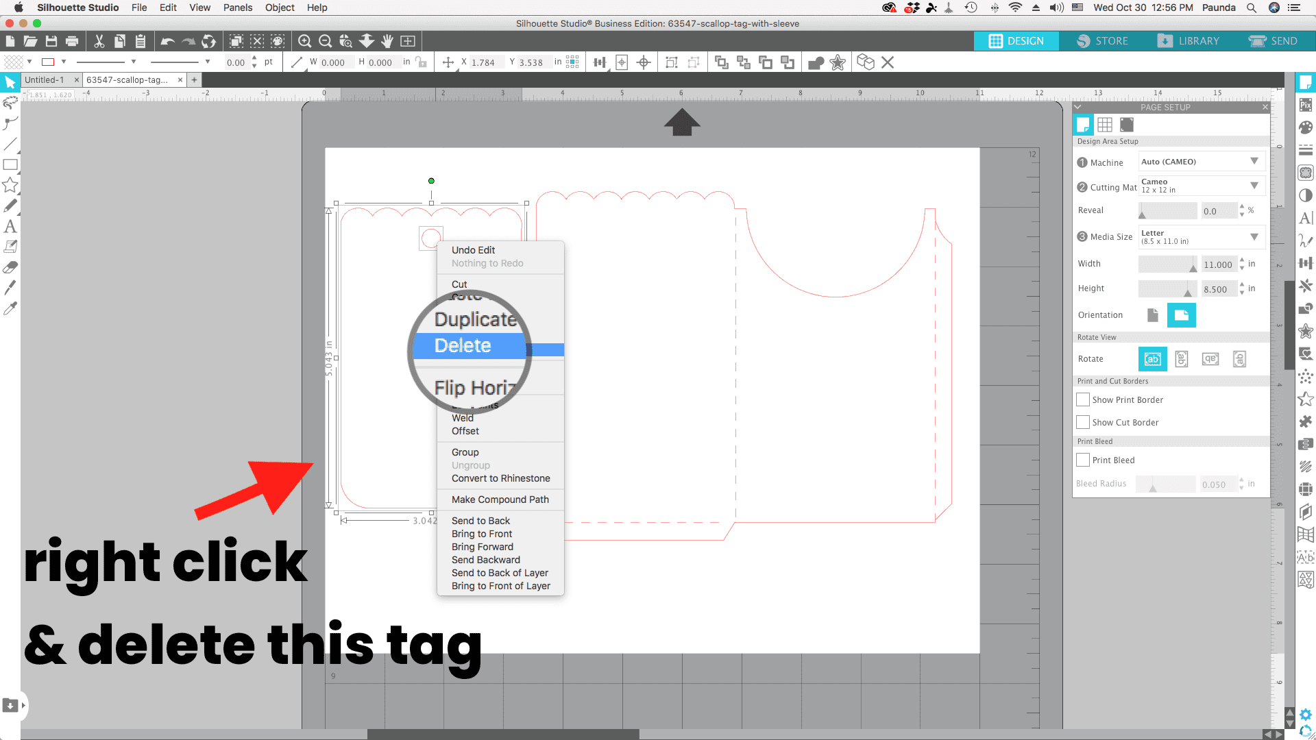 You won’t need the tag so you can just delete that. First ungroup the whole design. Then delete the tag only. Then group the rest of the entire design by selecting all of it and selecting group.