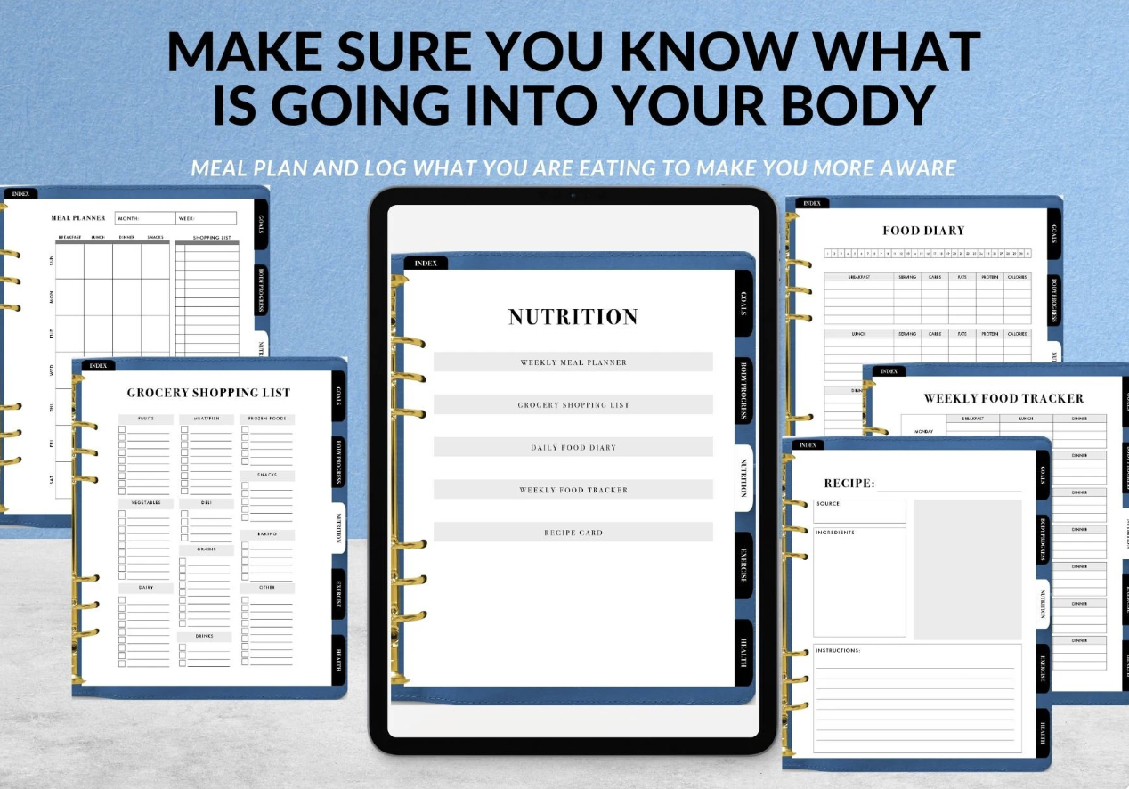 This planner is your all-in-one system for staying consistent with your wellness goals. You’ll find goal-setting pages, habit trackers, meal planners, and body progress trackers, all designed to help you plan smarter and celebrate your progress along the way.